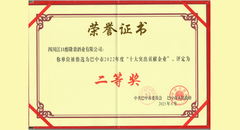2023年6月,四川江口醇隆鼎酒业有限公司被市委市政府推选为巴中市2022年度“十大突出贡献企业”,评定为二等奖。