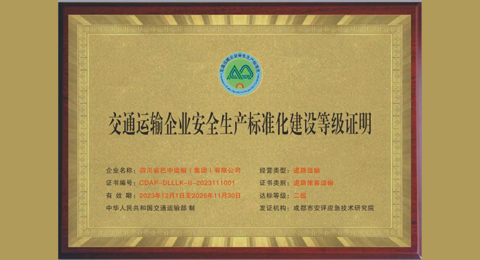 根据《交通运输部关于印发(交通运输企业安全生产标准化建设评价管理办法》的通知》交安监发〔2016〕133号文件精神,巴运集团完成了交通运输企业安全生产标准化建设,获得成都市安评应急技术研究院颁发的二级等级证明。