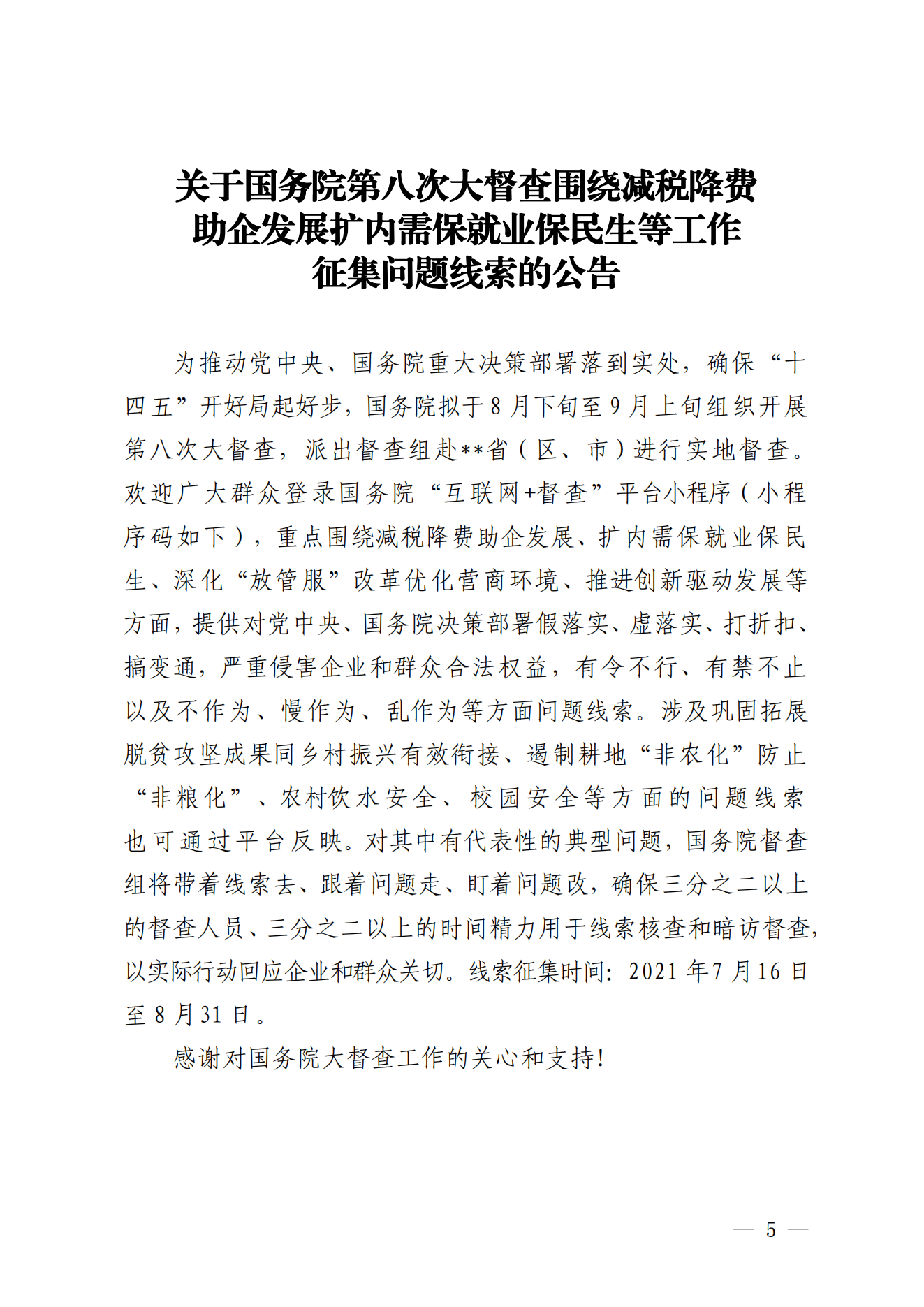 关于国务院第八次大督查围绕减税降费助企发展扩内需保就业保民生等工作征集问题线索的公告